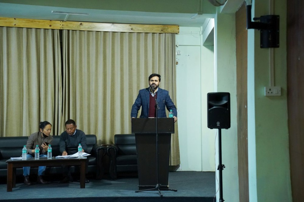 Shashank Pratap Singh (IAS), Principal Director of DoSE and Project Director of NECTAR, addresses the gathering during the training and orientation programme on ESS at the Directorate of School Education in Kohima on February 20.