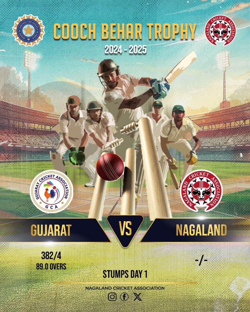 Nagaland’s Sundram Kumar took 3 wickets for 124 runs. On Day 2, Nagaland will seek early breakthroughs, while Gujarat will aim to sustain their strong momentum.