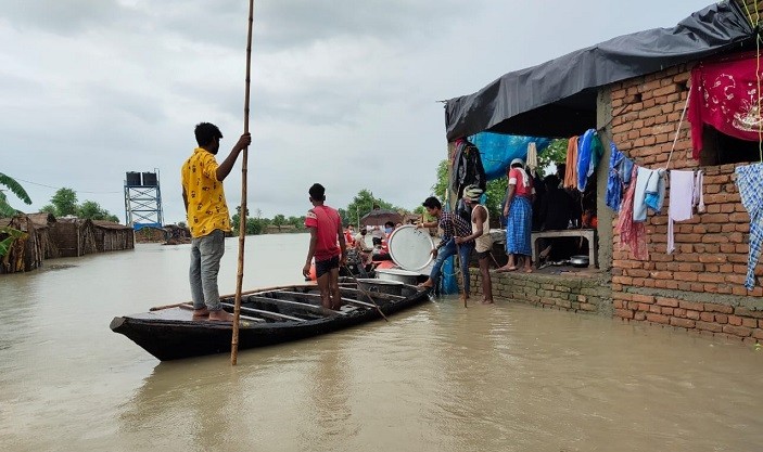 In Gopalganj, many villages of Sadar and Manjagarh blocks are submerged. Temporary houses and huts have been damaged and people are taking shelter on the roofs of pucca houses.