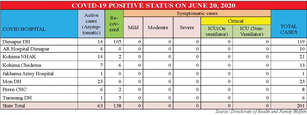 COVID-19 cases in Nagaland crossed the 200-mark as 3 new cases were reported on June 20, taking the state’s tally of cases to 201. Out of the three cases, 2 patients were from Kohima Quarantine Centre (QC) while one was from Dimapur QC.