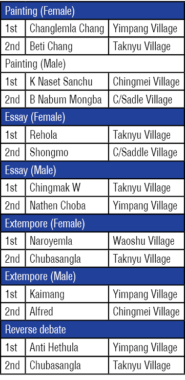 The judges for the literary events were Ebou Chang BDO, Nabum Tombou Assistant Research Officer, Art & Culture, Changsonla PGT GHSS Tuensang and Achi GT.
