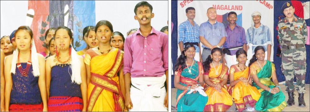 (Left) participants performing a song (Right) Minister Merentoshi and Maj. Gen. R.K. Sharma with NCC cadets during the cultural extravaganza in the ongoing Special National Integration camp.