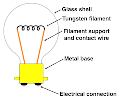 Inside this vacuum, there’s a thin coiled wire called a “filament”, made of a metal called tungsten.
