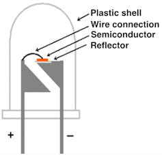 But instead of heating up a wire to produce the white light, an LED light has a special material inside it called a “semiconductor” to produce the light.