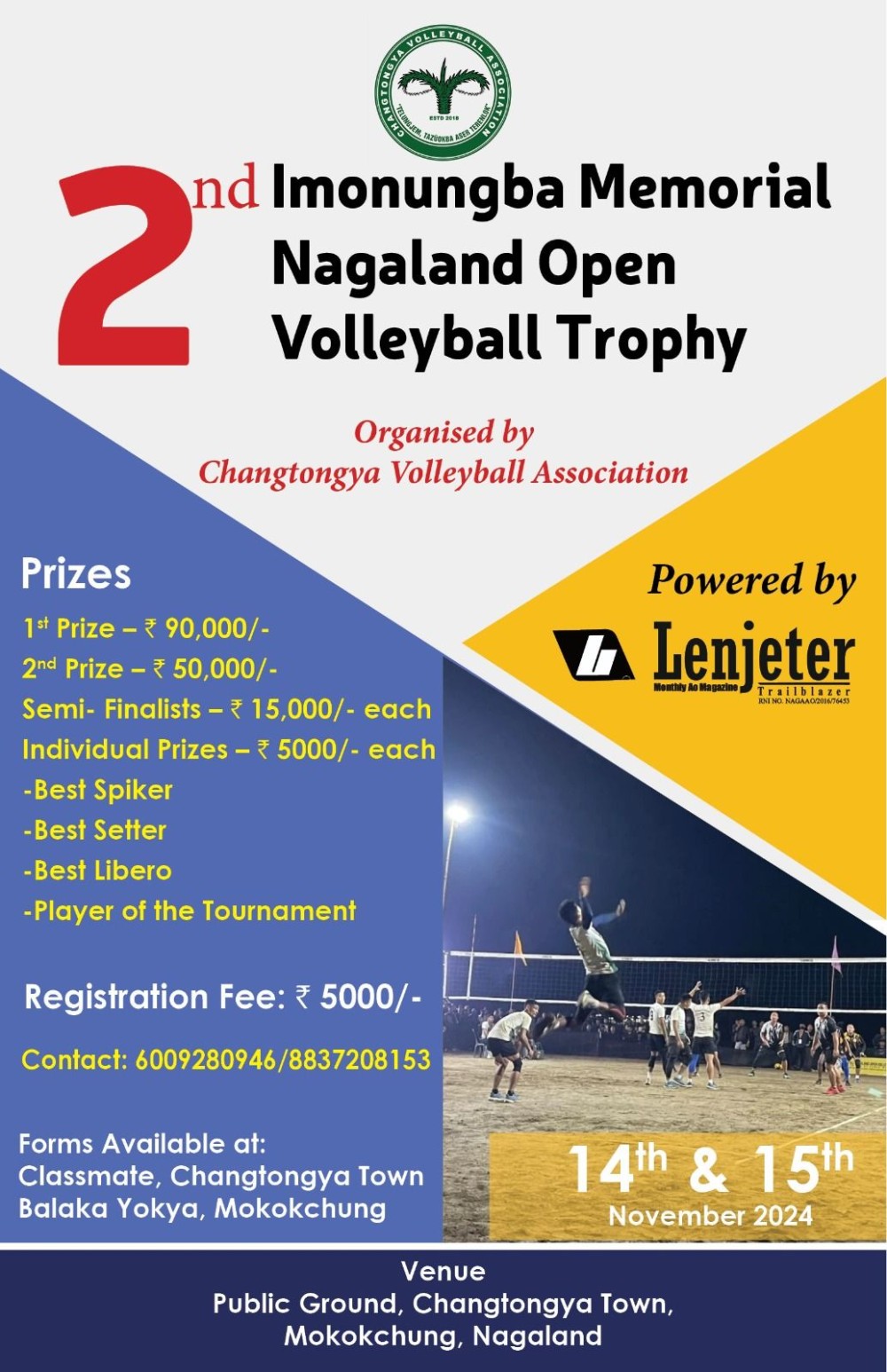 Changtongya, October 22 (MExN): The Changtongya Volleyball Association (CVA) has announced that the 2nd Imonungba Memorial Nagaland Open Volleyball Trophy will be held from November 13 to 15, 2024, in Changtongya Town.