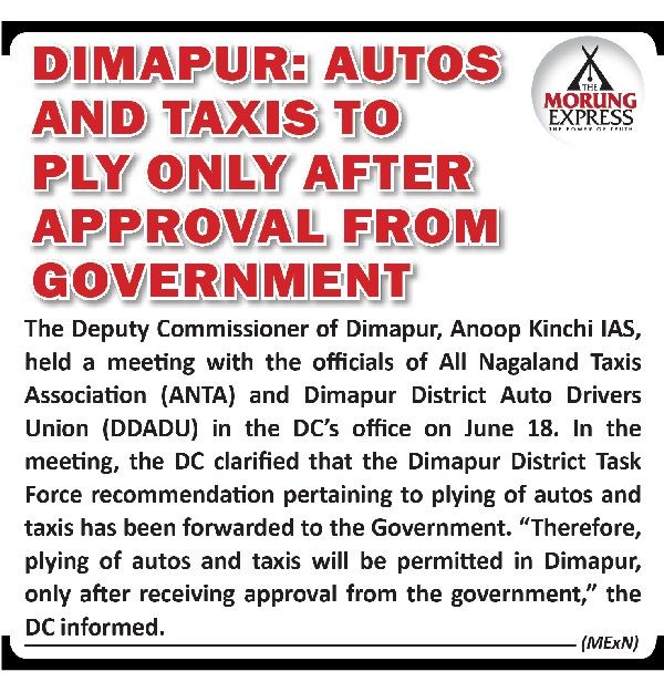 Dimapur, June 18 (MExN): The Deputy Commissioner of Dimapur, Anoop Kinchi IAS, held a meeting with the officials of All Nagaland Taxis Association (ANTA) and Dimapur District Auto Drivers Union (DDADU) in the DC’s office on June 18. A per a DIPR report, in the meeting, the DC clarified that the Dimapur District Task Force recommendation pertaining to plying of autos and taxis has been forwarded to the Government. “Therefore, plying of autos and taxis will be permitted in Dimapur, only after receiving approval from the government,” the DC informed.