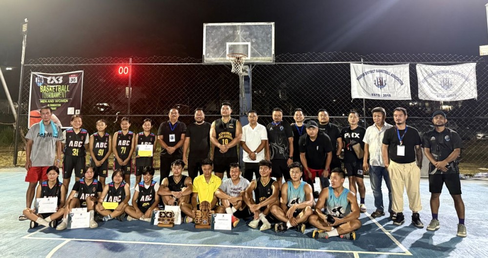 Players and officials of the Dimapur District Basketball Association (DDBA) One-Day 3x3 Basketball Tournament pose for a group photo after the finals at JV Basketball Court, Signal Angami, Dimapur on August 29.