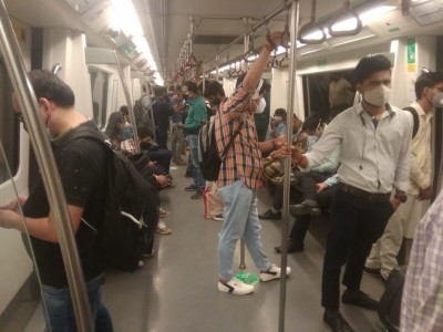 New Delhi, June 7 (IANS): On the very first day Delhi Metro rail services resumed its operations after nearly a month of complete suspension due to the raging second wave of Covid -19 pandemic, commuters on Monday were seen breaking norms put in place.