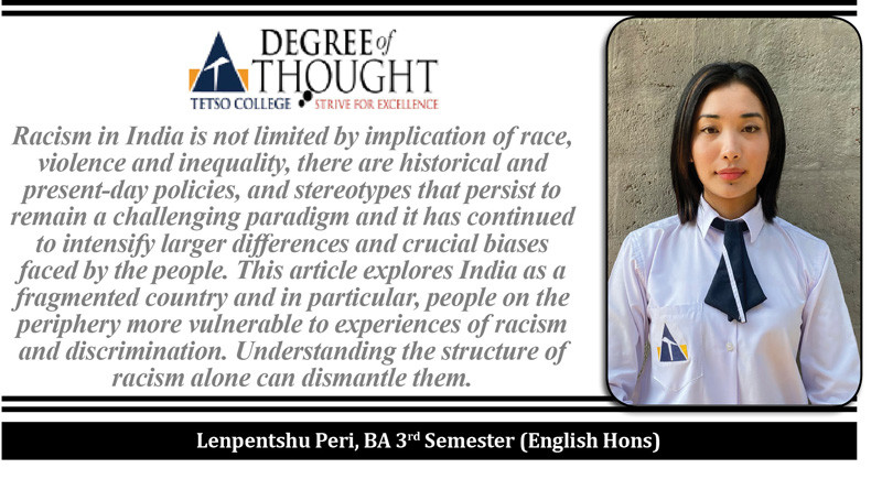 A common instance of racism being defined clearly or rather a more confused term among the Nagas particularly to those who pursue their career. A pluralistic, multi-ethnic and racial co-existence is a necessity if a vibrant and progressive nation and community has to be set up. Apartheid is not the solution when India is termed strongly as a nation with unity in diversity. Racism must not become a part of our intellectual consciousness and one must be abhorrent to it. The egalitarian principle must be inculcated, wherein every system of practice, belief, identity, origin, opportunities and similar fundamentals must equally be envisioned and imparted. India had always been an open bowel ready to imbibe and transpire. It has always been generous enough in guiding and influencing world views in various aspects. Racism should be a deep concern in an opportunistic world as it divides the very roots of any society and weakens the institutional structure. One must remember that it was during the era of the British that they created the “Divide and Rule” policy just to split and dissect Indians in every ground leaving no stones unturned. Now, it is our duty not to recreate the vandalism of racism but to unleash the democratic power and bring changes to the traditional system of belief and overview about our neighbours and create conditions towards social, economic and political welfare.