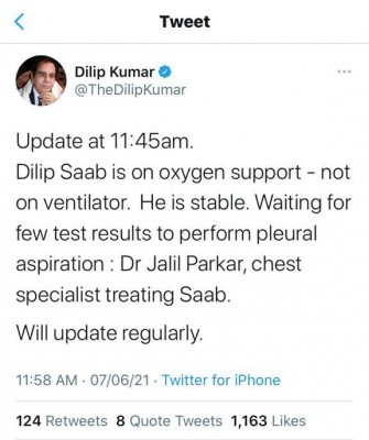 "Update at 11.45 a.m., Dilip Saab is on oxygen support -- not on ventilator. He is stable. Waiting for few test results to perform pleural aspiration : Dr Jalil Parkar, chest specialist treating Saab. Will update regularly," the tweet read.
