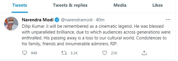 "Dilip Kumar Ji will be remembered as a cinematic legend. He was blessed with unparalleled brilliance, due to which audiences across generations were enthralled. His passing away is a loss to our cultural world. Condolences to his family, friends and innumerable admirers. RIP," the Prime Minister said in a tweet.