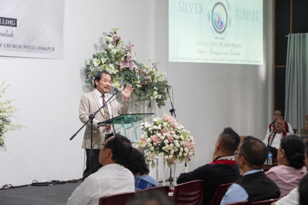 Akok Walling speaking at the Dimapur Meküli Shisashir Telungjem silver jubilee at World Impact Community Church, Padum Pukhuri on October 18.