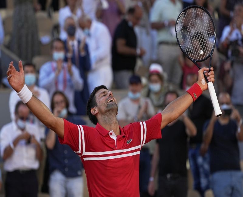 Serbia's Novak Djokovic celebrates after defeating Stefanos Tsitsipas of Greece in their final match of the French Open tennis tournament at the Roland Garros stadium Sunday, June 13, 2021 in Paris. (AP/PTI Photo)