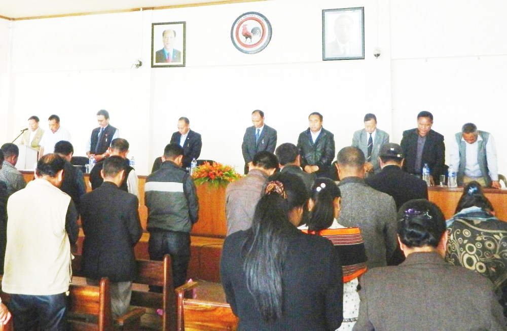 Legislators and others observing one minute silence in remembrance of late Thungchamu who passed away on May 10 last. (Morung Photo)