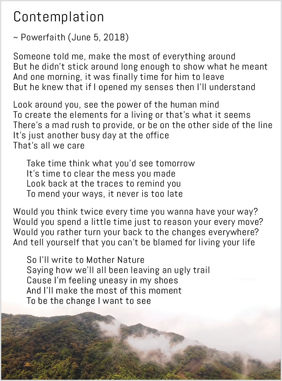 ‘Contemplation’ cries about the destruction caused and strongly sends out the message for mankind to free itself from the rush of everyday busy life and realize the importance of taking good care of the environment. The second part in the first verse of the songs says, “There’s a mad rush to provide, or be on the other side of the line. It’s just another busy day at the office. That’s all we care.”