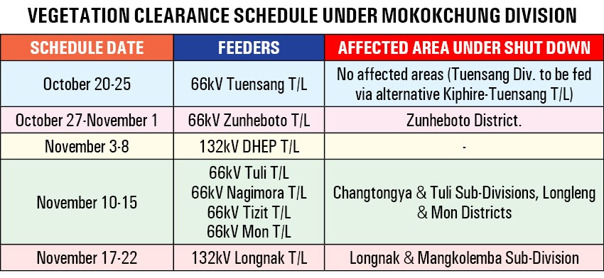 Mokokchung October 7 (MExN): The Transmission Division Mokokchung under the Department of Power Nagaland (DoPN) has announced a monthly-long vegetation clearance for 132kV and 66kV Transmission Lines under its division starting October 20.