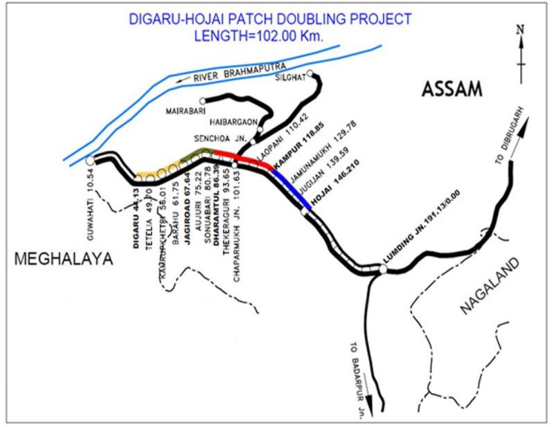 The release stated that the Digaru – Hojai section of 102 km length was sanctioned for doubling in the Railway Budget of 2015-16. The foundation stone of the project was laid by the then Railway Minister Suresh Prabhakar Prabhu on November 10, 2016 and construction of 11 major, 73 minor and 5 road over bridges were involved in this section apart from earth work. The revised estimated cost of the work is more than Rs 2,136 crore, it added.