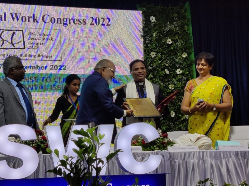 Dr Fr CP Anto received the ‘NAPSWI Young Achievers Award 2022’ on December 15 at Ahmednagar, Maharashtra during the Xth Indian Social Work Congress. (Photo Courtesy: NEISSR)