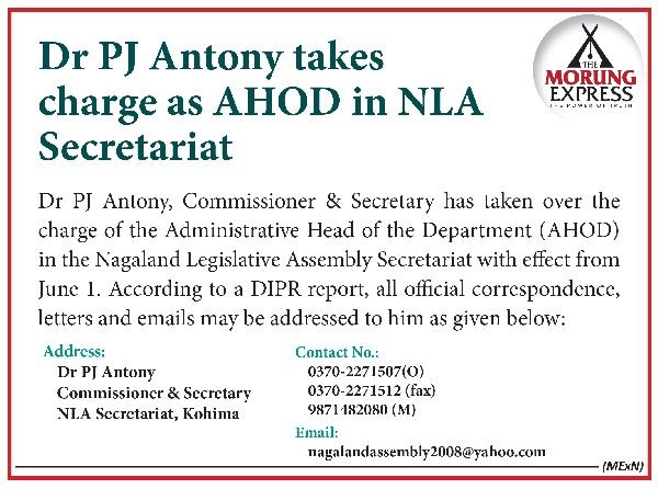 Kohima, June 19 (MExN): Dr PJ Antony, Commissioner & Secretary has taken over the charge of the Administrative Head of the Department (AHOD) in the Nagaland Legislative Assembly Secretariat with effect from June 1. According to a DIPR report, all official correspondence, letters and emails may be addressed to him as given below: