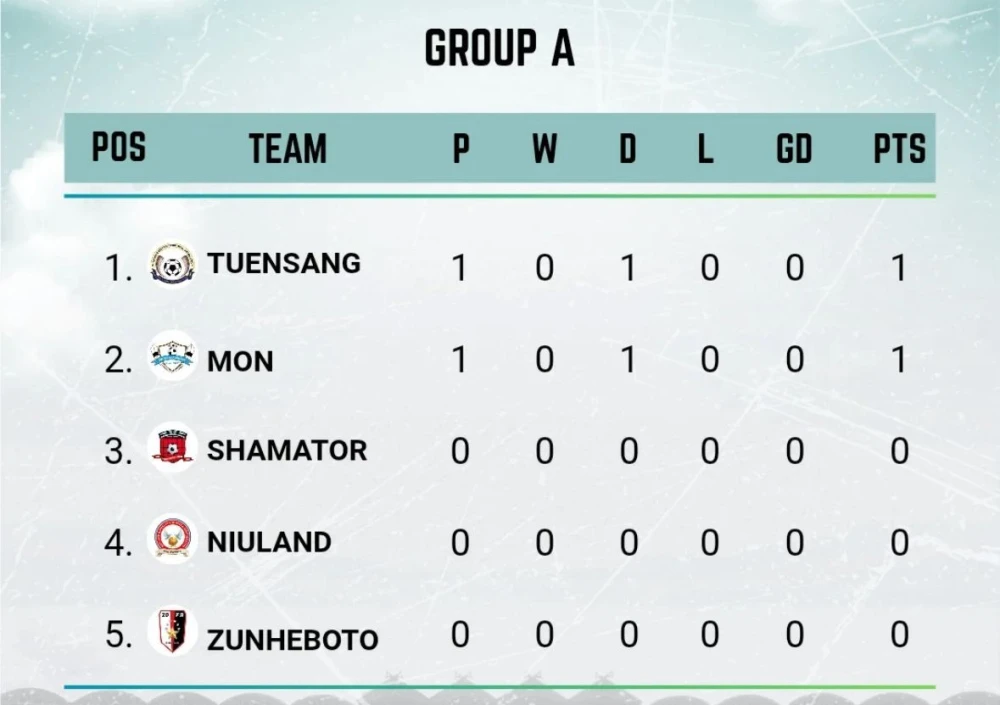 The day opened with Tuensang holding Mon to a 1-1 draw. Mon’s K. Arap gave his team the lead in the 22nd minute, but Tuensang levelled the score in the second half through an own goal by Mon’s Sanyem in the 70+1st minute.