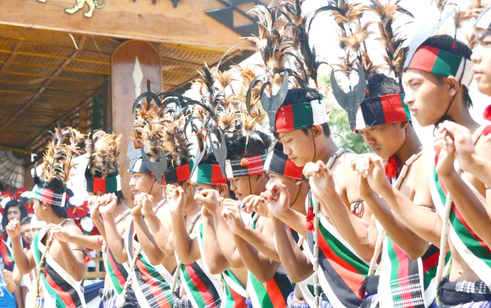 The Moyon Naga students are seen performing a cultural dance during the 25th General Conference of the Naga Student’s Federation at Dimapur, Nagaland on Friday. (Photo by Caisii Mao)
