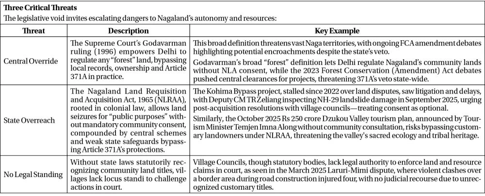 To secure Nagaland’s future, the Nagaland Legislative Assembly must overhaul limited frameworks like the Nagaland Village and Area Councils Act, 1978 or the 2025 Nagaland Forest Act Amendment, both of which favour state control over community land rights, by crafting comprehensive state legislation with three community-empowering pillars: