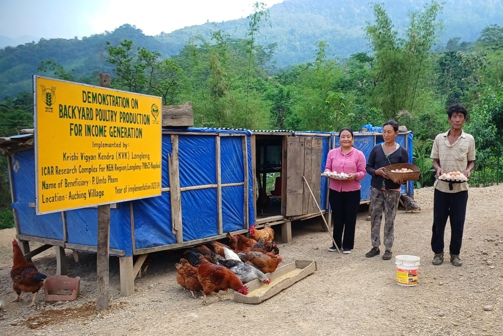 Rearing of poultry birds is an integral part of rural mass in Longleng district. Majority of the farmer rear only indigenous poultry birds due to non-availability of improved varieties of chicks in the market. Longleng district enjoys monsoon type of climate with a minimum temperature of 10° C in winter and a maximum of 28° C in summer. The weather is well suited for rearing improved varieties of poultry birds in the district. Taking into consideration the potential of poultry rearing in Longleng district, KVK selected Mrs. Umto Phom, a farmer from Auching village for sustainable livelihood through backyard poultry production. Critical inputs like 100 numbers of Day old chicks, feeder, drinker, antibiotic powder, liquid vitamin supplements were provided. The chicks were vaccinated as per schedule. The overall survivability percentage was 95 per cent up to 20th weeks. The average body weight at 4th weeks was recorded as 368±0.058 g per bird that increased up to 2.485± 0.440 g at 20th weeks. The poultry birds were allowed to scavenge during the day time from 8th weeks onward. The poultry birds were reared up to 32 weeks only. Commercial ration were given with additional supplementation of feeds like maize, paddy grains and green leafy vegetables. The income was mainly from the sale of live birds and egg at the rate of Rs.300 per kg and Rs. 10 per piece respectively. The net return from the sale of culled live birds and eggs is Rs.46080 with BC ratio of 2.18.