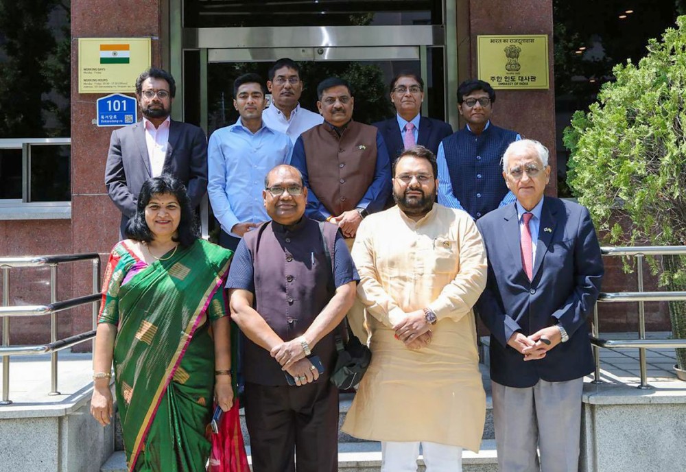 Seoul: An all-party delegation led by JD(U) MP Sanjay Kumar Jha attends a crucial briefing by the Indian Ambassador at the Indian Embassy as part of India's global diplomatic outreach under Operation Sindoor in Seoul. The delegation includes BJP MPs Aparajita Sarangi, Brijlal, Pradhan Baruah, and Hemang Joshi; Congress leader and former External Affairs Minister Salman Khurshid; TMC MP Abhishek Banerjee; CPI(M) MP John Brittas; and former Ambassador Mohan Kumar. (Photo: IANS/@AITCofficial)
