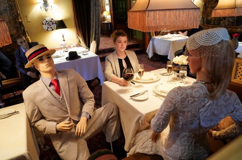 Executive Assistant Jessie Dawson sits among mannequins occupying some tables so diners will not feel isolated by social distancing measures when The Inn at Little Washington, a Michelin three-star restaurant, reopens shortly in Washington, Virginia. REUTERS/Kevin Lamarque