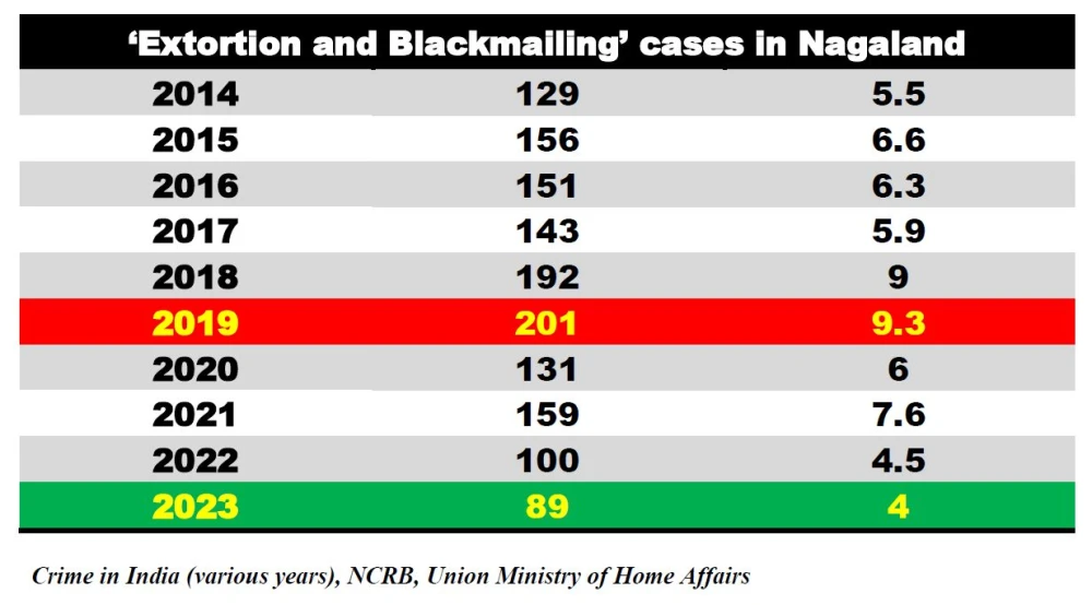 In a positive development, the number of ‘Extortion and Blackmailing’ cases in Nagaland has dropped to the lowest level in a decade, even as the State continues to record one of the highest crime rates in India under this category, an analysis of the National Crime Records Bureau (NCRB) reports has shown.