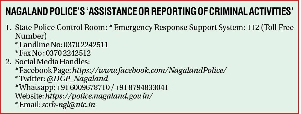 In June 2020, the Nagaland Police circulated contact details for “any police assistance or reporting of criminal activities” across various media platforms, shortly after a letter from the Governor to the Chief Minister raising ‘serious concerns’ over the law and order situation went public.