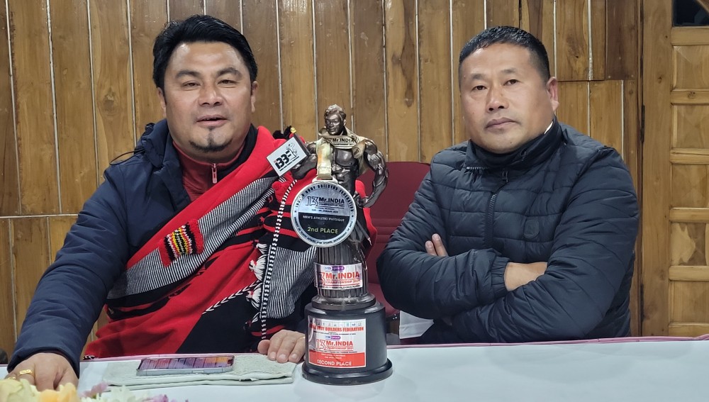 Nagaland’s Youth Resources & Sports Advisor Er Zale Neikha and Nagaland Football Coaches Association (NFCA) president Roko Angami during a felicitation programme for Keneilelie Sorunuo (Kenny Soru) at Hotel Japfü, Kohima on February 5. Mentionably, Keneilelie Sorunuo of Zhadima village won silver medal under Men's Athletic Physique category at 13th Mr India Senior National Body Building & Physique Sports Championship 2021 held on January 6 to 8, 2022 in Khamman, Telengana organized by Indian Body Builders Federation and Ministry of Youth Affairs & Sports, Government of India. (Morung Photo)
