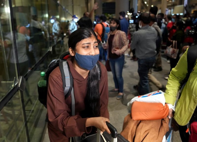 Mumbai: Indian nationals, evacuated from crisis-hit Ukraine, upon their arrival at the airport in Mumbai, Saturday, Feb 26, 2022. The first Air India flight carrying 219 Indian nationals from Ukraine landed Mumbai airport after taking off from the Romanian capital Bucharest. (PTI Photo/Kunal Patil)