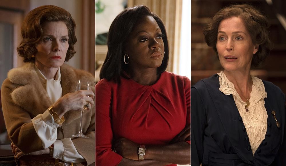 This combination of photos released by Showtime shows, from left, Michelle Pfeiffer as Betty Ford, Viola Davis as Michelle Obama and Gillian Anderson as Eleanor Roosevelt, in separate scenes from "The First Lady," premiering Sunday. (Showtime via AP)