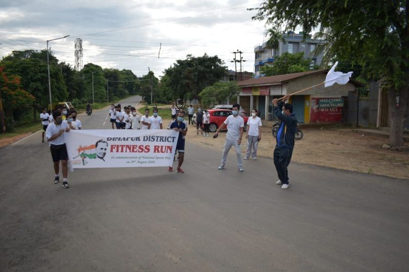 Dimapur District Sports Council, Vice President, Tsenthungo Lotha flags off the Fitness Run from Airport Junction Dimapur on August 29. Commemorating the National Sports Day, Fitness Run under ‘Fit India Movement’ was conducted with the initiative of District Sports officer Dimapur, in collaboration with NSS Dimapur. A total of 30 NSS volunteers from 8 colleges and 3 program officers participated in the fitness run which commenced from Airport Junction to Agri Expi Junction Dimapur. (DIPR Photo)
