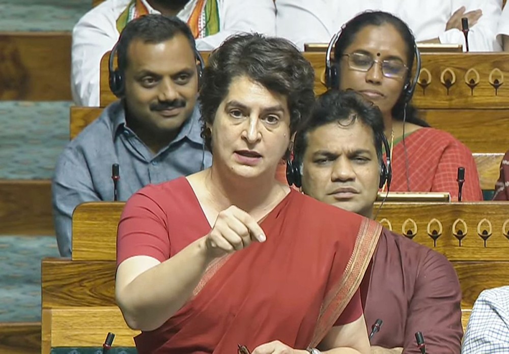 New Delhi: Congress MP Priyanka Gandhi Vadra speaks in the Lok Sabha during the Monsoon Session of Parliament in New Delhi, Tuesday, July 29, 2025. (Photo: IANS/Sansad TV)