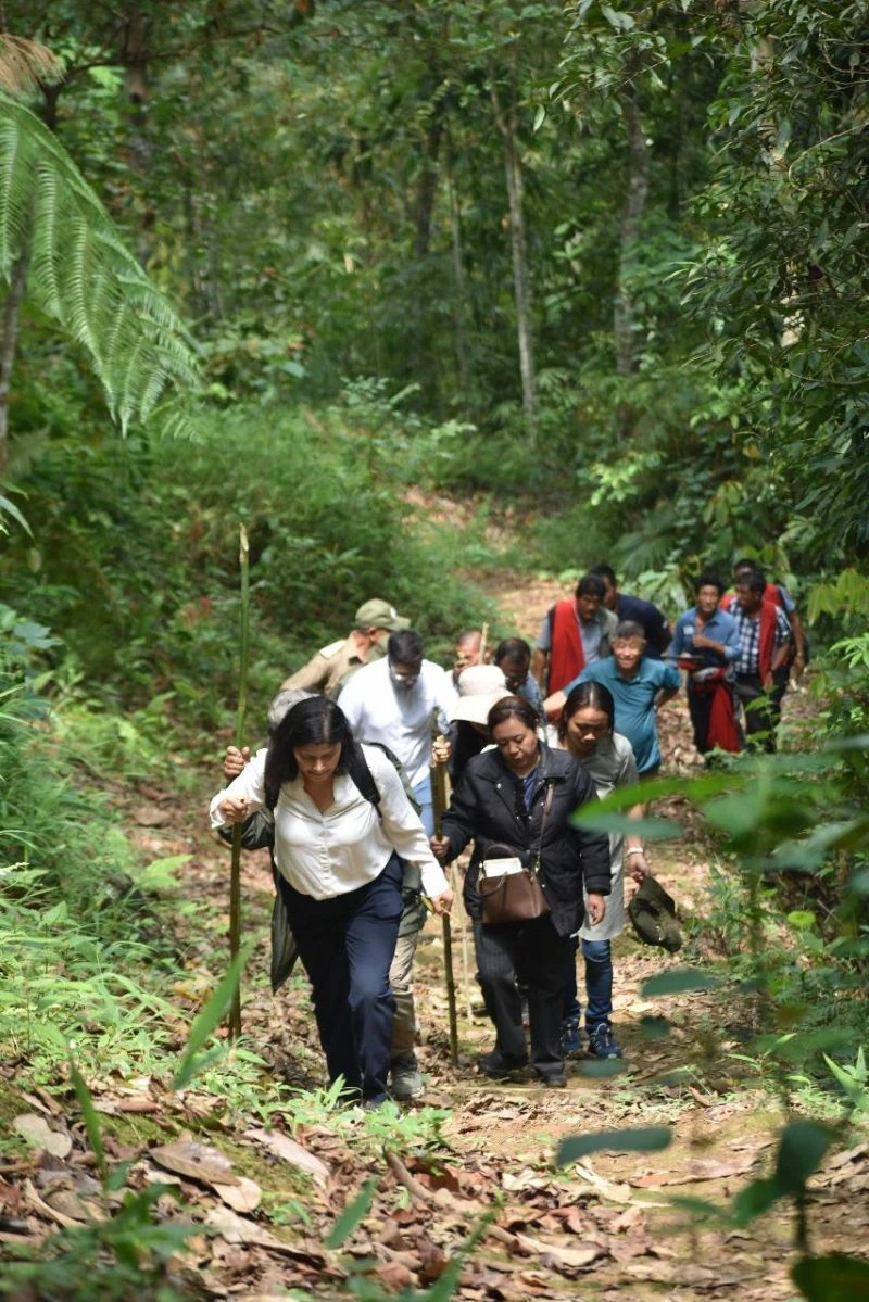 In Merangkong village, the team reviewed initiatives by Joint Forest Management Committees (JFMCs) and Self Help Groups (SHGs), including income-generating and skill-building activities. The team also visited a treatment site under the Joint Agroforestry (JAF) model and observed encouraging growth of tree species like Duabanga grandiflora, Ailanthus altissima, and Phoebe sp.