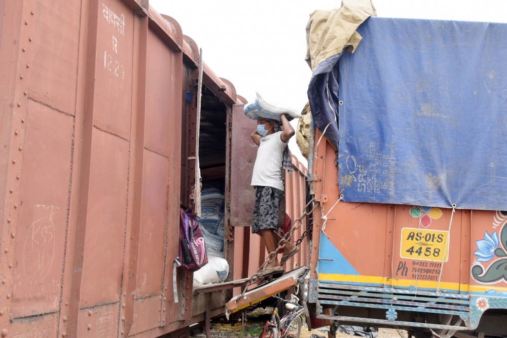 A worker loads goods at a train station under the NFR. As per an official release, freight loading under NFR jurisdiction increased by over 30.6%, in April-December, 2021, when compared with corresponding period in 2020. (Photo: NFR CPRO)
