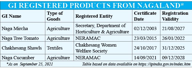 Four products from Nagaland so far has been granted GI registration. The first to get the tag was ‘Naga Mircha’ under the then Department of Agriculture and Horticulture on December 2, 2003. The next was ‘Naga Tree Tomato’ on March 23, 2015 NERAMAC. The next to get was Chakhesang Shawls under Chakhesang Women Welfare Society on October 24, 2017. The fourth is the Naga Cucumber (See table). Applications for Ao, Angami and Sumi Naga shawls were ‘abandoned’ as per the GI portal.