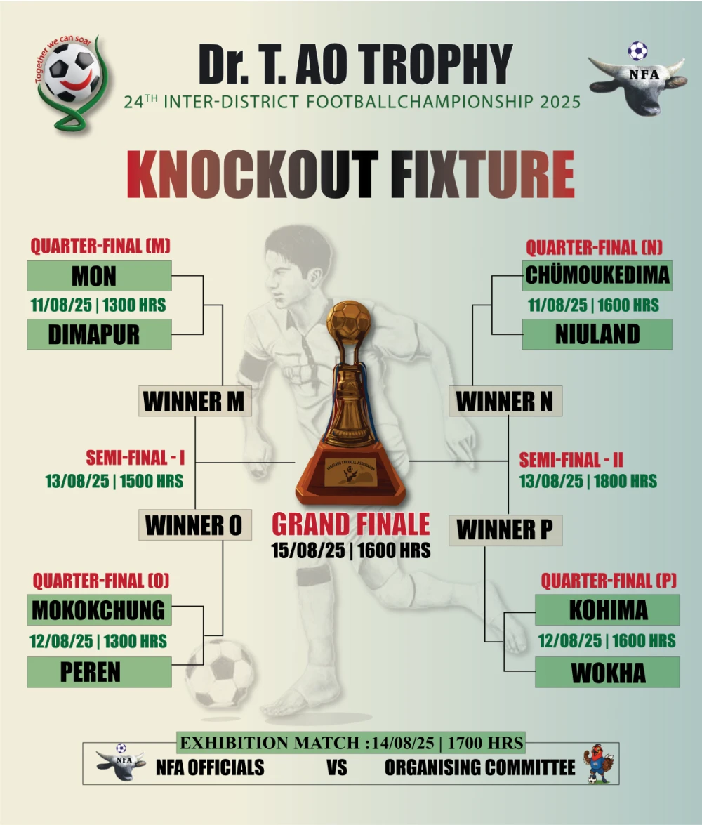 The group stage of the Dr T Ao Trophy concluded on August 9 with four matches that showcased attacking masterclasses, emotional finales and knockout stage dreams decided in the dying minutes. From Wokha’s four-goal display to Niuland’s stoppage-time winner, the day offered no shortage of drama before the final whistle.