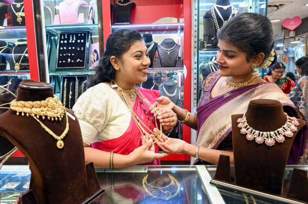 Mumbai: Two women try on gold jewellery at a jewellery shop on the occasion of Akshaya Tritiya in Mumbai on Sunday, April 19, 2026. (Photo: IANS)
