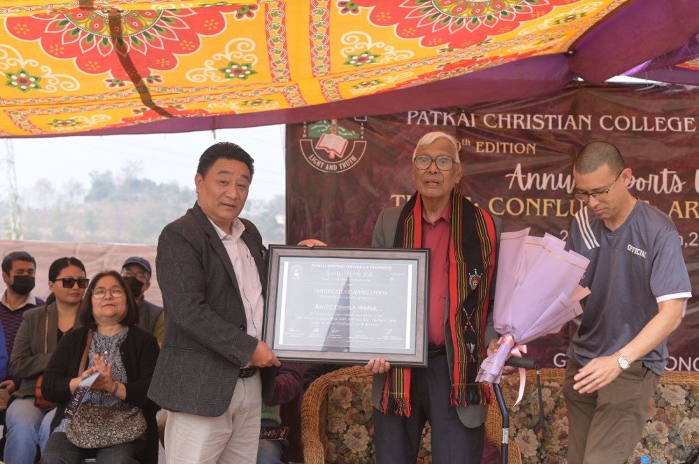 Founder and Principal Emeritus Rev Dr Tuisem A Shishak being felicitated during the Golden jubilee Sports Meet of the PCC held in Chümoukedima on March 2.