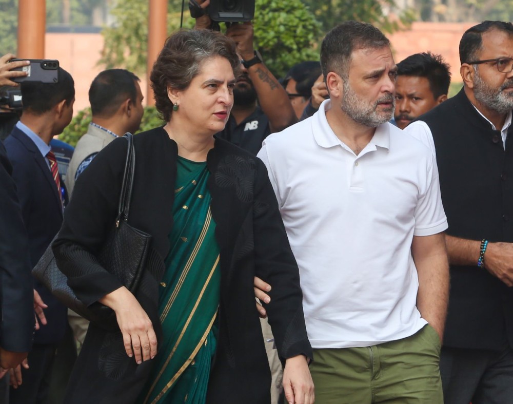 New Delhi: Leader of Opposition in Lok Sabha Rahul Gandhi and Congress General Secretary and Party MP Priyanka Gandhi Vadra at the Parliament House premises during the Winter Session of Parliament, in New Delhi on Friday, December 12, 2025. (Photo: IANS/Qamar Sibatin)