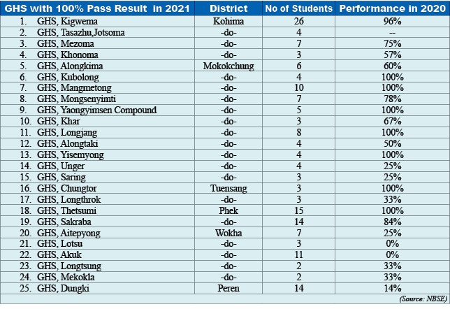 According the HSLC Exam 2021 results declared by the Nagaland Board of School Education (NBSE) on July 20, GHS securing ‘zero/nil result’ decreased from 34 in 2020 to 23 in 2021.
