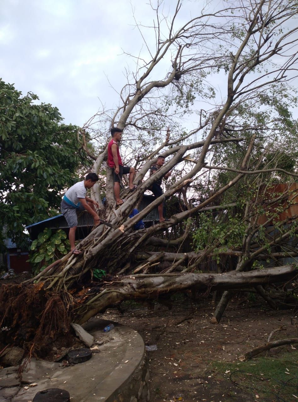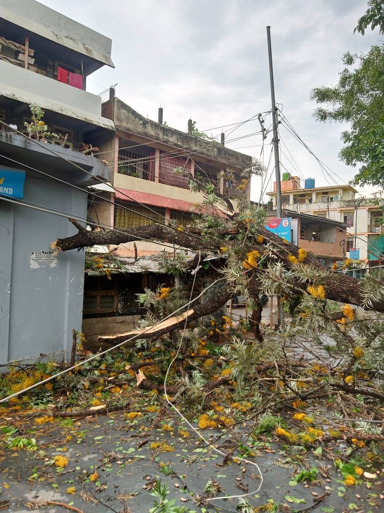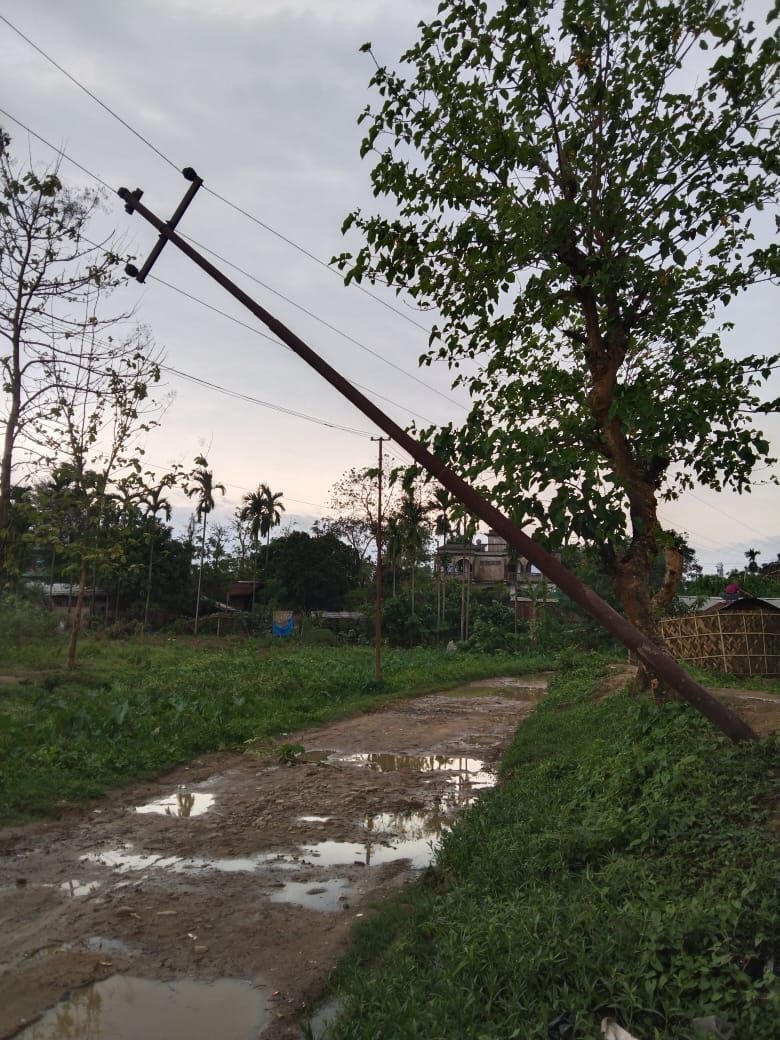 In Landmark colony, one Low Tension police was knocked down by flying roofing material. A tree uprooted near the Pranabanda College, also bringing down an LT line. In two other places, trees fell, entangling LT lines. The exact number of locations where damages were reported was not available but similar scenes were witnessed in many other locations within town, including the DC office and Khermahal areas. East of the Dhansiri, Khushiabill, Darogajan, Zani, Thilixu, Chekiye, airport area, ARTC and Diphupar were places where line damage was reported.
