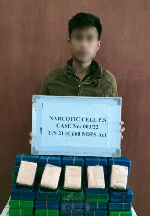Kohima, March 1 (MExN): Personnel of Narcotic Cell Police Station, CID, manning the Narcotic Check Point Khuzama, Kohima on February 27, stopped a vehicle B/R No. MNOSP-1 186 (Maruti Ciaz), silver colour, for routine checking at around 1:00 pm. A search of the vehicle and the occupant resulted in the seizure of 50 soap cases of suspected heroin weighing approximately 600 grams, worth approximately 1.8 crore in the illicit global market, stated a n update received here. One person, Lenminthang Khongsai (29s) has been arrested. In this connection, a case vide Narcotic Cell PS Case No. 003/2022 U/S 21 (C)/ 60 NDPS Act has been registered for further investigation, it added.