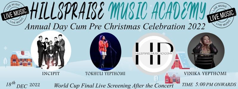 Dimapur, December 16 (MExN): Hillspraise Music Academy will be organising a live concert on December 18 at Zakiesatuo Road, Eros Lane, Dimapur. Students will be performing recitals and solos followed performances by Incipit a modern rock band, Vinika Yepthomi and Tokhuli Yepthomi who are acclaimed solo artists.