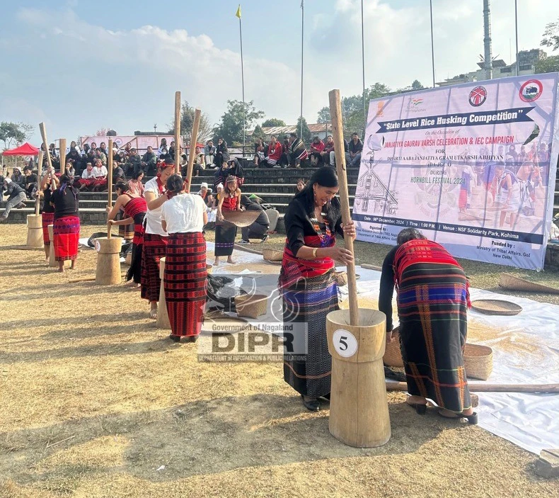 The State Level Rice Husking Competition saw the participation of 30 contestants from 15 tribes. They were judged on the quality as well as the quantity of husking the grains. The winners of the competition were Ngapkhao & Ayo (Konyak) at 1st position, A. Soyaü Phom & Hantenhaila (Phom) in 2nd position and Mengzi & Lalam Lenthang (Kuki) placed at 3rd.