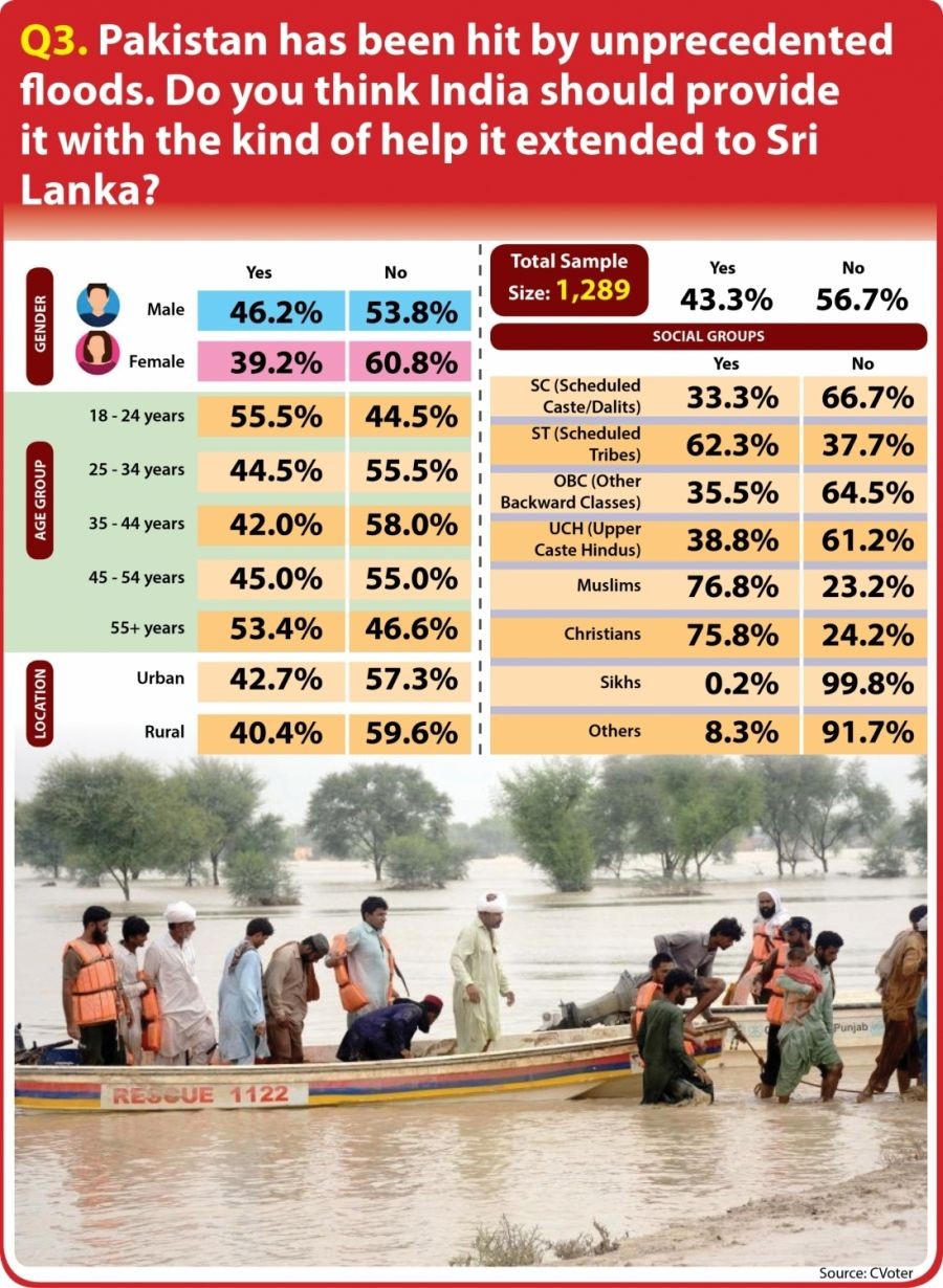 Notably, during the survey, while a bigger proportion, 56 per cent, of respondents in 18-24 years age category and 56 per cent above 55 years of age expressed their views in favour of providing help to Pakistan, a large proportion, 56 per cent, of respondents from 25-34 years age category and 58 per cent respondents in the age group of 35-44 years spoke against it.