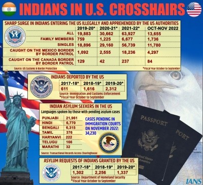 US authorities encountered 63,927 Indians who had entered the country illegally, during the 2021-22 fiscal year that ended in September, a 109 per cent increase from the 30,662 they found the previous fiscal year, according to Customs and Border Protection (CBP) data.